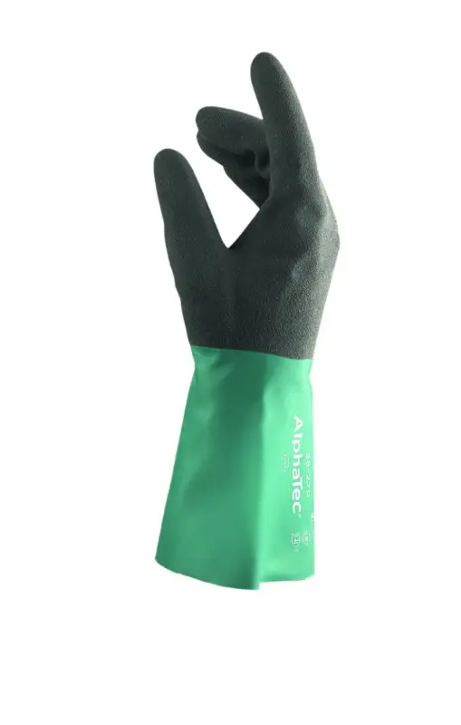 Naadloze vloeistofdichte nylon handschoen met dunne dubbelwandige nitrilcoating. Goede vingergevoeligheid, grip en en elasticiteit door voering. Voedingsgeschikt, latex- en siliconenvrij, antistatisch. Lengte 30cm.
