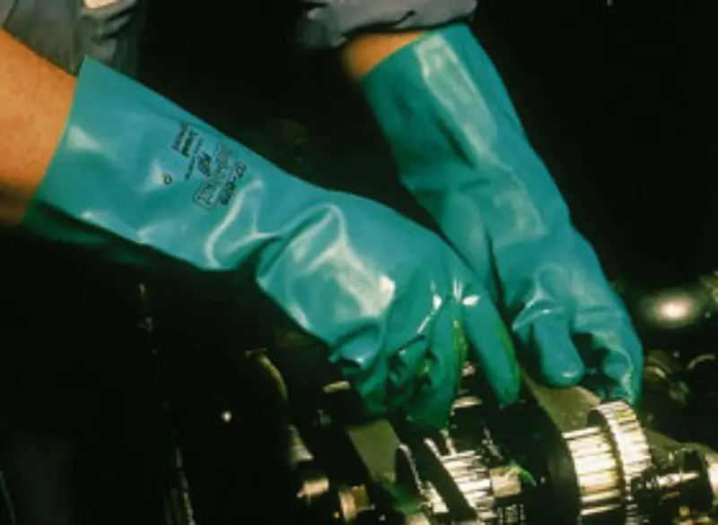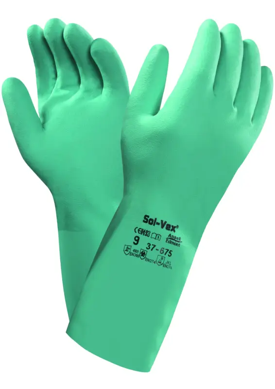 Gevlokte nitrilhandschoenen met zandkorrelreliëf voor goede grip en vingergevoeligheid bij behandeling van natte voorwerpen. Goede b escherming tegen alle veelgebruikte oplosmiddelen en bestand tegen abrasie. Geschikt voor bescherming tegen chemicaliën. Geschikt voor (petro)chemische nijverheid en voedingssector. Siliconenvrij. Geschikt voor gebruik in voedingsindustrie. Kleuren: groen. Lengte 33 cm, dikte 0,38 mm. Maten: 6 / 7 / 8 / 9 / 10 / 11.