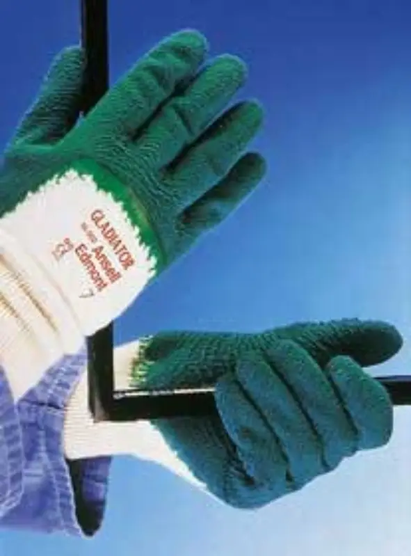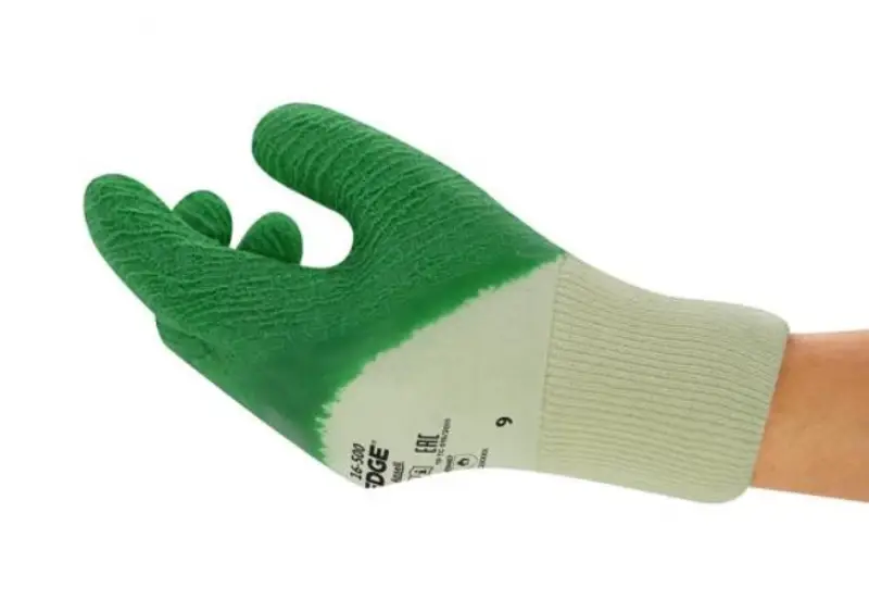 Handschoenen met opgeruwde rubbercoating op interlock voering met open rug en tricot manchet. Goede snijweerstand en zeer goede grip op droge én natte of gladde oppervlakken.