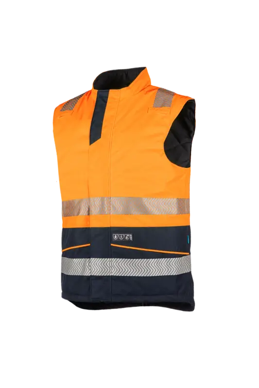 Vlamvertragende, antistatische signalisatie bodywarmer Vikja: Rechte kraag; Ritssluiting onder flap met klittenbandsluiting; 2 opgezette zakken; 2 lussen voor gasdetectoren; 1 Napoleonzak. Kwaliteit: Dobby ripstop polyester stof (& AST) + ademend FR PU + inherent FR breien; ± 280 g / m². Beschikbare maten: S-3XL. Beschikbare kleuren: Fluo geel / navy en fluo oranje / navy.