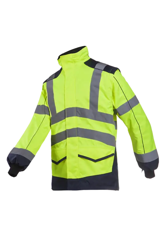 Deze jas is voorzien van gebreide windmanchetten in de mouwen, twee zakken aan de binnenkant en twee zakken aan de buitenkant. De mouwen zijn afneembaar en deze jas kan worden voorzien van een capuchon. De ademende, waterafstotende buitenstof en de vochtabsorberende coating aan de binnenkant beschermen je tegen natte weersomstandigheden. Beschikbare kleuren: Hi-Vis geel / Navy en hi-vis oranje / marine. Beschikbare maten: S – 4XL. In overeenstemming met: EN ISO 20471 klasse 3, EN 14058 en EN 343 klasse 3: 3.