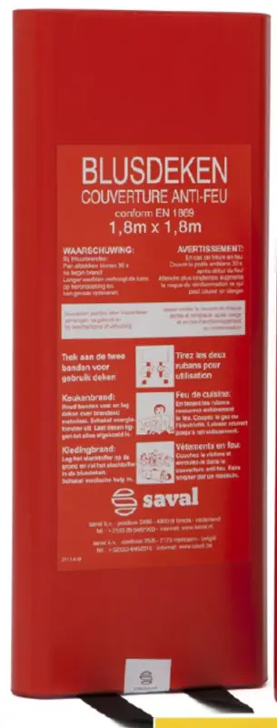Branddeken in glasvezel, 180 x 180 cm. Voor bevestiging aan muur, rode behuizing. Met Nederlandstalige en Franstalige opdruk.