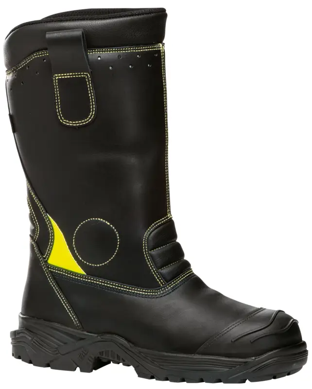 Brandweerlaars voor professioneel gebruik in zwart water –en vuurbestendig rundsnerfleder met 200J neus en antiperforatiezool in kunststof. Dubbel gestikt met Kevlar (waterbestendig en vuurbestendig). Reflectoren aan beide zijden, AN enkelbescherming in rubber. Dubbele flexie voor –en achteraan. Voering in Gore-Tex. Zool in PU/Nitril. Overneus in rubber. Geïntegreerde treklussen in rubber. Maten: 38-48.