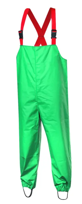 Bretelbroek chemie in PVC C2. Deze broek is voorzien van verstelbare bretellen, de broekspijpen van elastieken rond de enkels en ter bevestiging elastieken onder de voetzool. Beschikbaar in: groen. Maten: M – XXL.