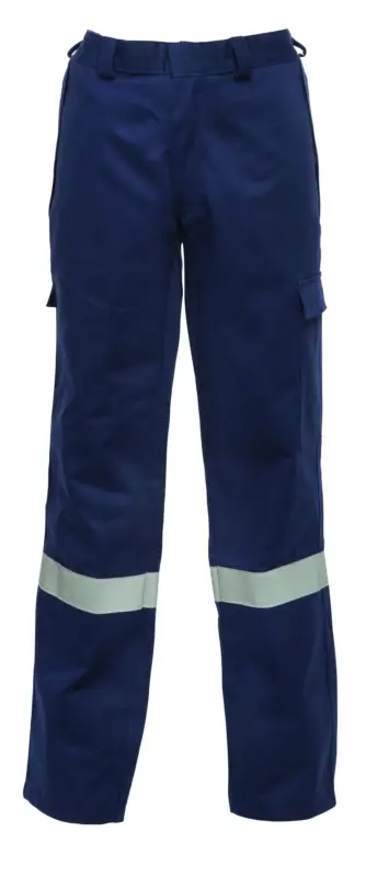 Broek vlamvertragend en antistatisch, 80% katoen 19% polyester 1% antistatische draad, satijnbinding, 280gr./m², 2 steekzakken, 1 dijbeenzak met klep, 1 meterzak met klep, 1 achterzak met klep, kniezakken, elastiek in de tailleband rugzijde, verdekte sluiting, retro-reflecterende banden. Beschikbaar in: navy;