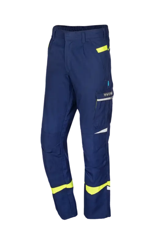 Vlamvertragende broek Barcus met ARC-bescherming: Gulp met ritssluiting; 2 ingezette zakken met klep; 1 achterzak met klep; 1 opgezette dijbeenzak; 1 kruisje; Elastische taille; Kniezakken; Tailleband met riemlussen. Kwaliteit: 24% PES + 75% katoen + 1 AST; ± 250 g / m². Beschikbare kleuren: Blauw / fluo geel. Beschikbare maten: 48 S – 58 S – 44 R – 64 R – 46 L – 56 L. In overeenstemming met: IEC 61482-2: 2009 klasse 1 – ATPV 8.4 cal / cm², EN ISO 11612: 2015 / A1 A2 B1 C1 E1 F1, EN ISO 11611: 2015 / Klasse 1 – A1 A2, EN 1149-5: 2008 en EN 13034: 2005 + A1: 2009 Type PB [6].