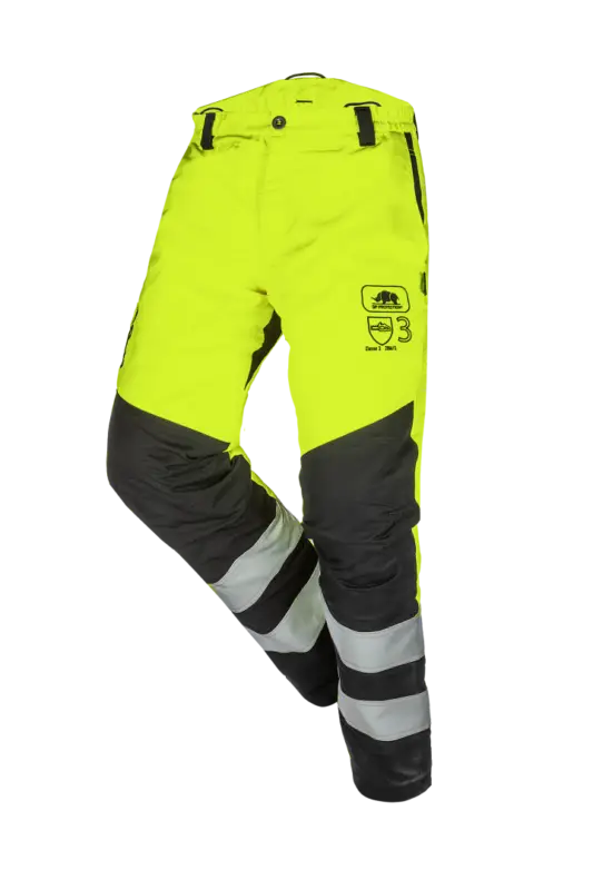 De Hi-Vis klasse 3 BasePro kettingzaagbroek is ontwikkeld om de hoogst mogelijke bescherming tegen frontale kettingzaag te bieden volgens de norm EN 381-5: Gulp met ritssluiting – sluiting met 1 knoop; 2 ingezette zakken; 1 opgezette achterzak met ritssluiting; 1 opgezette zak voor plooimeter en systeem voor het bevestigen van de bougiesleutel; Elastische taille met lussen voor riem en lussen voor bretellen met velcro; Lendenbovenstuk met lussen voor bretellen; 3-naaldstikking aan de achterzijde tot het kruis. Kwaliteit: 65% PES / 35% katoen. Beschikbare maten: S-3XL. Beschikbare kleuren: FLuo geel / zwart en fluo oranje / zwart.