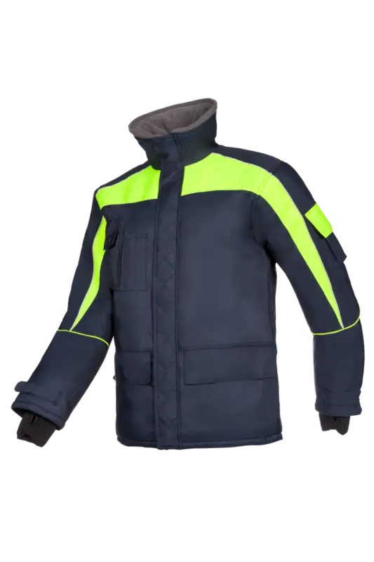 Beschermende diepvriesjas tot -40°C! De binnenkraag werd afgewerkt in fleece en ook het verlengde rugpand, de mouwvernauwing en de gebreide manchetten in de mouwen, die bovendien voorzien zijn van een praktisch dulabelat, helpen het warmteverlies te beperken. De schouders werden voorzien van versterking om slijtage tegen te gaan en ook de elastische vernauwing in de rug is een comfortabel pluspunt van deze jas. Binnenkant: Vaste gewatteerde voering, Gebreide manchetten in de mouwen met dulabelat, 1 binnenzak. Buitenkant: Binnenkraag in fleece, Voorzien voor kap (kap apart verkrijgbaar), Ritssluiting met flap, 1 opgezette borstzak met klep 2 ingezette zakken met flap, 1 mouwzak + pennenzak Rond ingezette mouwen, Mouwvernauwing d.m.v. klittenbandsluiting Schouderversterking, Elastische vernauwing in de rug, Verlengd rugpand en Ruglengte 83 cm (L). Stof: 100% polyamide; ± 185 g/m²+ HV – 100 % PES ± 220 g/m² – Hi-vis Cordura: 100% polyester ± 210 g/m². Kleur: fluo geel/marine.