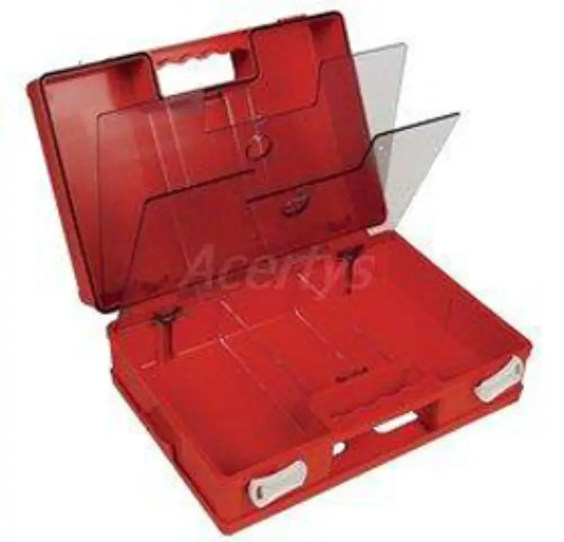 Lege EHBO-koffer in slagvaste ABS kunststof. Domino (270 x 190 x 115 mm)voor maximum 10 personen. Geschikt voor alle bedrijfsgebouwen. Inclusief muurbevestiging.
