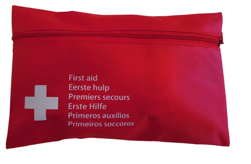 Rode EHBO-etui met een basis uitrusting eerste hulp materialen voor onderweg. Inhoud: snelverband 7x10cm, wondsnelverband, kleefpleister, wondpleister, Cambric zwachtel, elastische hydrofielen, gaaskompressen 5/5cm, verbandwatten, splinterpincet, zakschaartje, desinfectiedoekjes, veiligheidsspelden, Burnshield blots. Afmetingen: 22 x 14 cm.