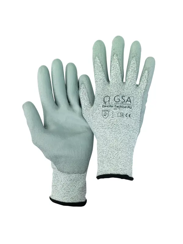 Snijbestendige, volledig naadloze grijze gebreide handschoen met grijze PU-coating. Excellente vingergevoeligheid gecombineerd met hoogste snijbescherming. Maten:7/8/9/10/11.