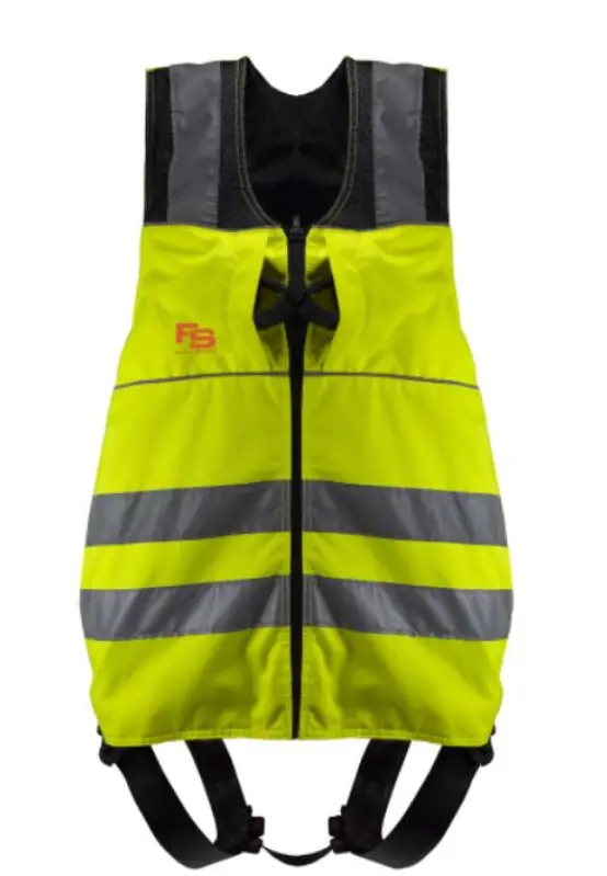 Makkelijk aan te trekken harnas in bodyvest met 2 bevestigingspunten, op de rugzijde en op de borst. Body in fluo geel polyester/katoen met stripings. Verstelbare borst- en beenriemen. Sluiting van de beenbanden d.m.v. snelsluiting. Voorzien van 2 borstzakken met velcrosluiting en bevestigingsmogelijkheden voor materiaaltas. Maten: S/M en L/XL.