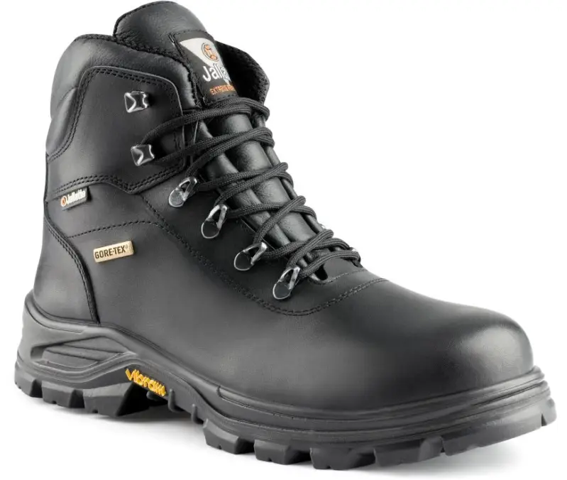 Hoge schoen in waterafstotend nerfleder, met een niet metalen antiperforatiezool van FleXtane™ By Jallatte, en een synthetische 200J neus. Voorzien van een ademende GORE-TEX voering. Zool in VIBRAM rubber, SRC antislip, bestand tegen oliën en zuren. Uitneembare inlegzool die het volledige oppervlak van de voet bedekt, verwijderbaar, antistatisch, anatomisch en met systeem dat de schokken van de hiel dempt. Vermogen om bovenmatige hoeveelheid zweet te absorberen en te desorberen. Maten: 38-47. Geschikt voor algemene industriële toepassingen. In overeenstemming met: EN ISO 20345 S3 CI HI WR HRO SRC.