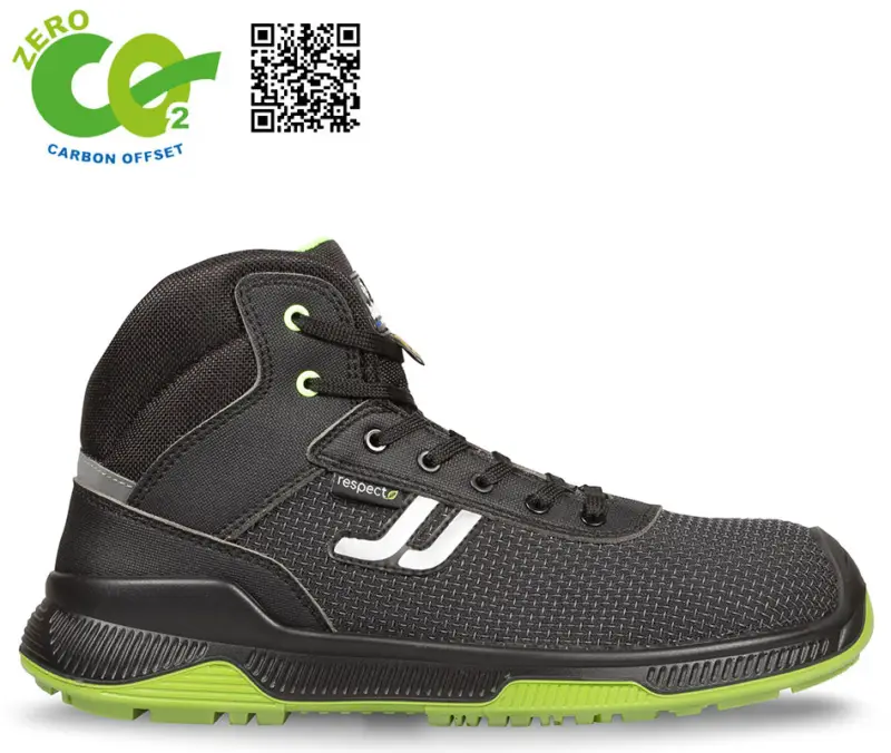 Hoge schoen in Putek® PLUS (68% gerecycleerd polyester), met een niet metalen antiperforatiezool (gemaakt uit 50% gerecycleerd polyester) en een synthetische 200J neus. Voorzien van een ademende, abrasiebestendige voering in 3D mesh Surf. Zool in PU/PU BASF BMB (BioMass Balance, gemaakt uit 100% hernieuwbare bronnen), SRC antislip, bestand tegen oliën en zuren. Uitneembare geperforeerde inlegzool Maxi-Soft Duo Green samengesteld uit een laag PU Dynamic van BASF® met thermogevoelig vormgeheugen en een laag BASF® BioMass Balance Elastopan, dit verbetert de gewichtsverdeling, vermindert drukpunten en absorbeert en verlicht stress op het lichaam als men langdurig staat en loopt. 100% metaalvrij. ESD gekeurd. Maten: 35-48.