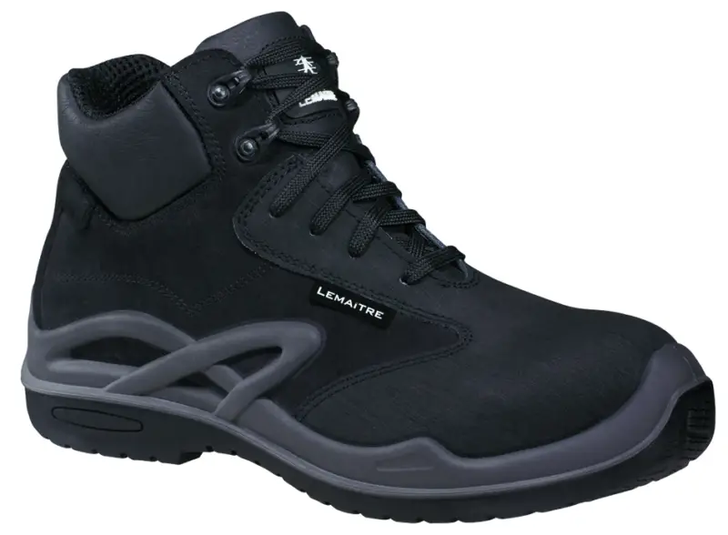 Hoge schoen S3 in zwart/grijs waterbestendig veloursleder, voorzien van een synthetische antiperforatiezool en kunstof 200J neus. Koude isolerende voering in non-gewoven textiel met goede ademendheid en abrasiebestendigheid. Zool uit PU/PU, met sterke antislip, schokabsorptie en oplopende zool. Anatomische inlegzool uit PU mousse, bestand tegen abrasie. Maten: 38-48.