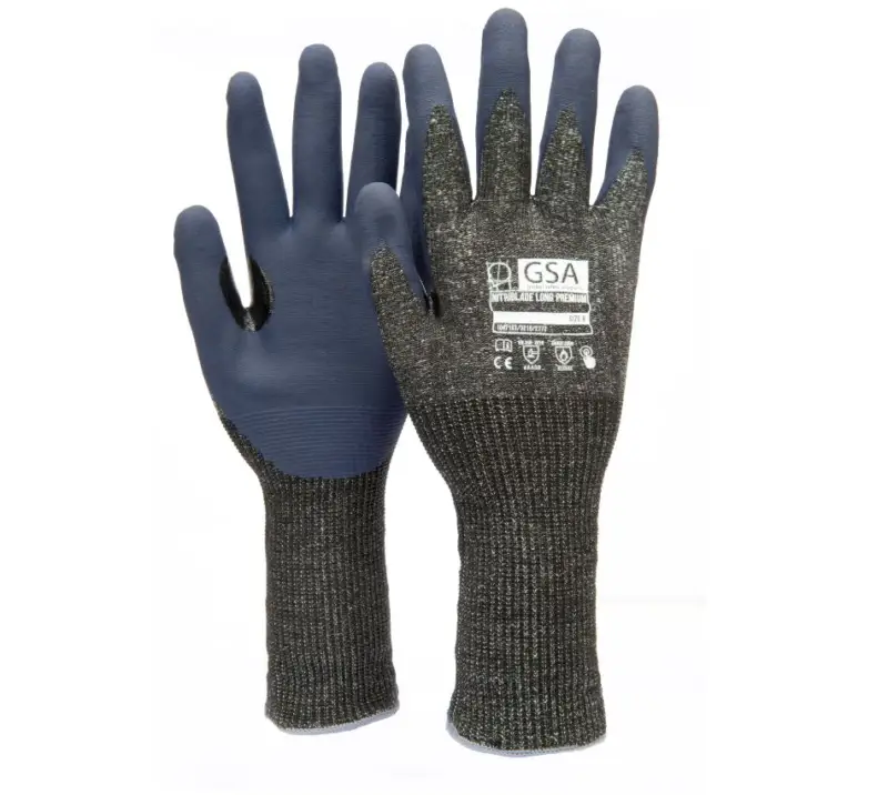 Gebreide snijbestendige handschoen (lange manchet 13cm) met een nieuwe foam nitril coating met touch sreen functionaliteit. De lining bestaat uit hoog snijbestendige PE vezels, nylon en Spandex. De nitril coating (op de palm) zorgt voor een uitermate goede grip op droge, maar ook op natte en beoliede oppervlakten. Zeer comfortabel en uitstekende bescherming tegen abrasie en met een extra versteviging tussen duim en wijsvinger. Geeft ook bescherming tegen contacthitte tot 100°C. Toepassing: glasindustrie, assemblage metalen, spuitgieten van kunststoffen. Beschikbare maten: 7- 12.