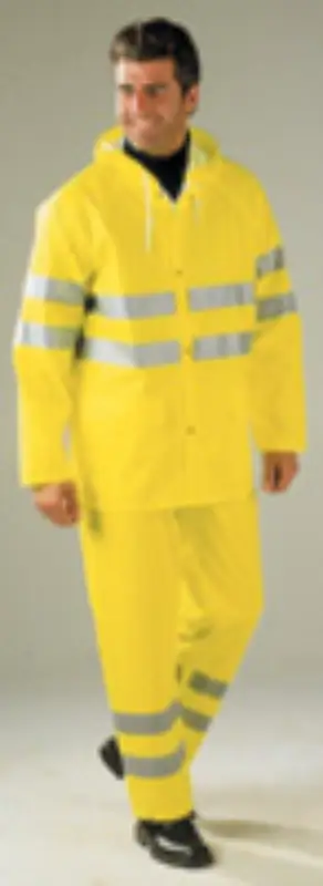 Signalisatie regenjas / 100% waterdicht / Winddicht / Soepel / Elastisch / Comfortabel / Lichtgewicht / Geluidsarm / Duurzaam / Hoog frequent gelaste naden / Buitenkant: Vaste kap / Ritssluiting onder beleg met drukknopen / 2 opgezette zakken / Raglan mouwen / Mouwvernauwing onder beleg met drukknopen / 2 opgezette zakken / Raglan mouwen / Mouwvernauwing d.m.v. drukknopen / Onderarmventilatie / Ruglengte 85 cm (L) / Stof: FLEXOTHANE® Classic: / 100% polyamide breisel met PU coating; ± 180 g / m² Kleur: 3720A2FC1: FC1 fluo oranje3720A2F01: FY1 fluo gee