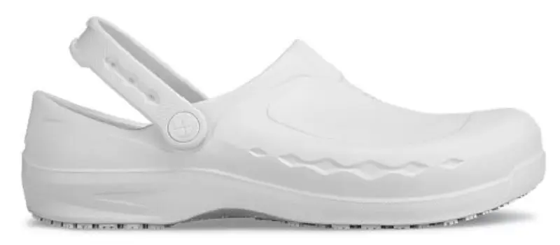 Witte lichtgewicht, all-round klomp uit gesmolten, antibacterieel EVA. Zijdelingse ventilatiegaten voor een betere ademendheid. Antislip zool uit Nitril. Met aanpasbare riem voor hielondersteuning. Maten: 37 – 47. Geen PBM.