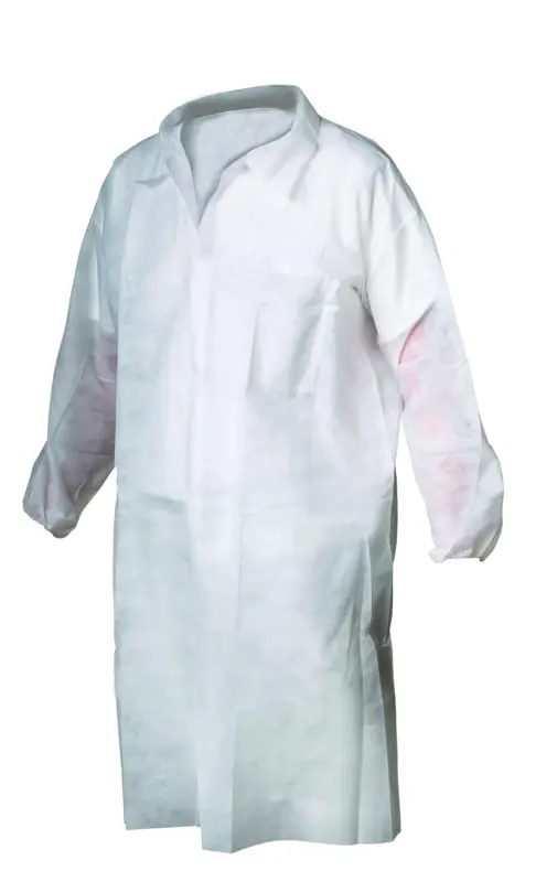 Witte labojas met drukknopen in polypropyleen (40 gr/m²). Zonder kap of zakken. Beschikbaar in: wit. Geschikt voor agro- en voedingsindustrie. Maten: M-XXL. Geen PBM
