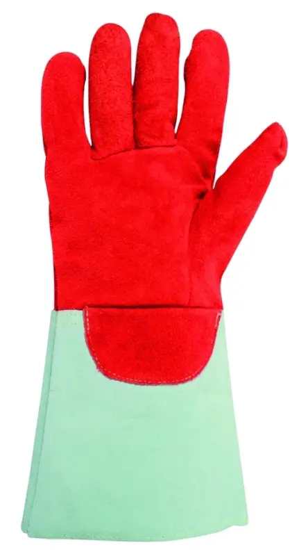 Handschoenen met Amerikaanse snit voorzien van hittebestendig rundsplitleder (tot 350°C), gevoerd met molton wol aan de hand en in de manchetten, aderbescherming, manchetten in natuurlijk splitleder en naden in Kevlar.