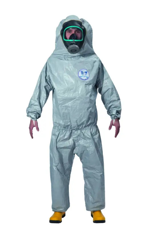 Overall in grijze Tychem F materiaal met vaste sokken en aangezette neopreen handschoenen. Voorzien van Butyl gelaatsafdichting om masker onder te dragen. Rits aan achterkant op schouderhoogte met overflap. Conform EN14605 type 3-4, EN 1073-2 en EN 14126:2003.