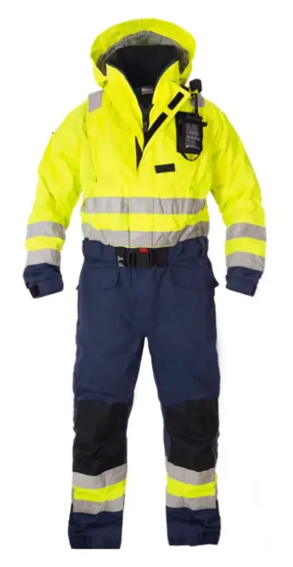Ki-Suit overall 165 met geïntegreerde reddingsvest: • Drijfvermogen 165N • Tricot-gaas; • ID-zak; • Borstzakken; • VHF-zak; • Antenne / microfoon-opzetstuk; • Mesbevestiging; • Verstelbare taille; • Neopreen achterkant; • Kneepad-zakken. Beschikbare kleuren: Fluo geel / marine. Beschikbare maten: S-3XL. In overeenstemming met: EN ISO 20471, EN 343 3: 3 en EN ISO 15027-1.
