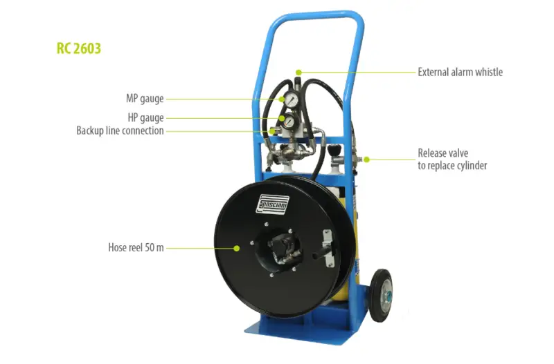 Persluchtkar met 2 flessen 6L 300 Bar en 50 m slang op haspel.