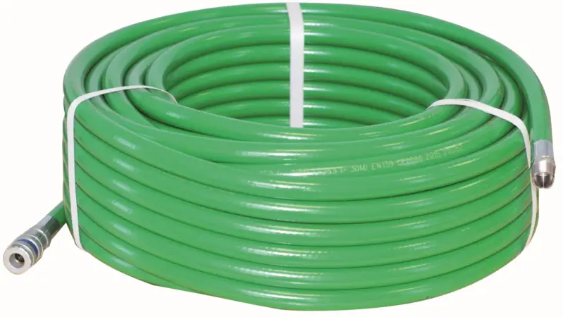 Groene persluchtslang 10 m in rubber. Kan o.a. gebruikt worden om verbinding te maken van compressor naar filterunit ademlucht en van filterunit naar gordel met koppelstuk of regelkraan. Mannelijke en een vrouwelijke CEJN veiligheid-snelkoppeling apart te voorzien.