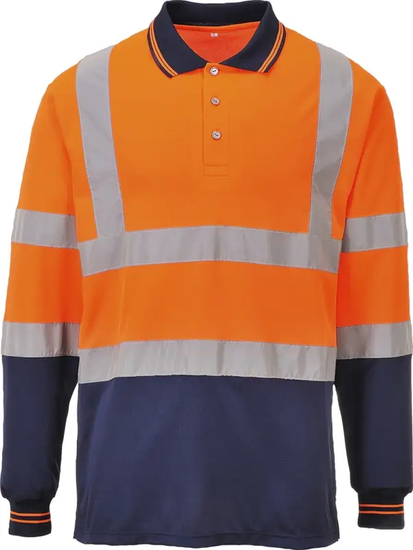 Signalisatie polo in 100% polyester bird eye (175g/m²). Lange mouwen, navy kraag, 3 knoopsluiting, horizontale en verticale reflecterende banden. Beschikbare maten: S-3XL. Beschikbare kleuren: Fluo geel/marine, Fluo oranje/marine.