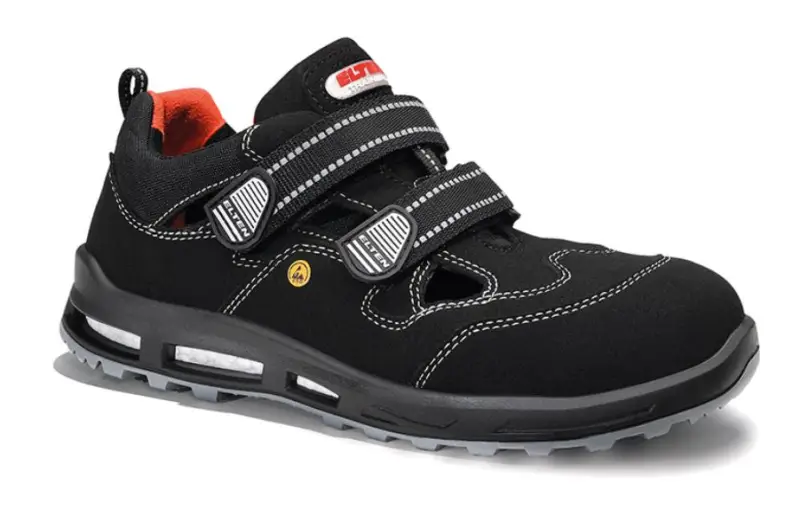 Sandaal in zwart gehydrofobeerd Cordura microvezel, met een niet metalen antiperforatiezool, gepolsterde watertong en een synthetische 200J neus. Voorzien van een ademende voering in textiel. Zool in PU/PU Wellmaxx, SRC antislip. Hele inlegzool die voldoet aan ESD normering. ESD gekeurd. Maten: 36-48.