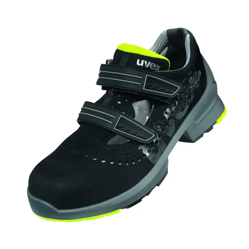 Zeer lichte en flexibele sandaal in zwart synthetische microvelours, met een niet metalen Uvex One 200J beschermneus. Voorzien van een ademende, abrasiebestendige voering. Zool in PU/PU, SRC antislip, bestand tegen oliën en zuren. Uitneembare inlegzool in polyurethaan met textiel laag. Maten: 35-52. Breedtematen: 10, 11, 12 en 14.