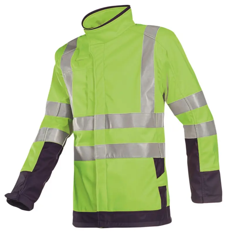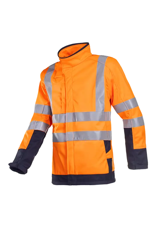 Vlamvertragende en antistatische signalisatie softshell in 100% polyester met FR PU coating en inherente FR fleece – 3-laags (400g/m²). Rechte kraag, ritssluiting onder beleg met klittenband, 1 ingezette borstzak met ritssluiting, 2 ingezette zijzakken, 1 gaslus, verstelbare manchetten dmv klittenband, gestikte naden, FR reflecterende banden, ruglengte L: 77 cm. Beschikbare maten: S-3XL. Beschikbare kleuren: Fluo geel/marine, fluo oranje/marine.