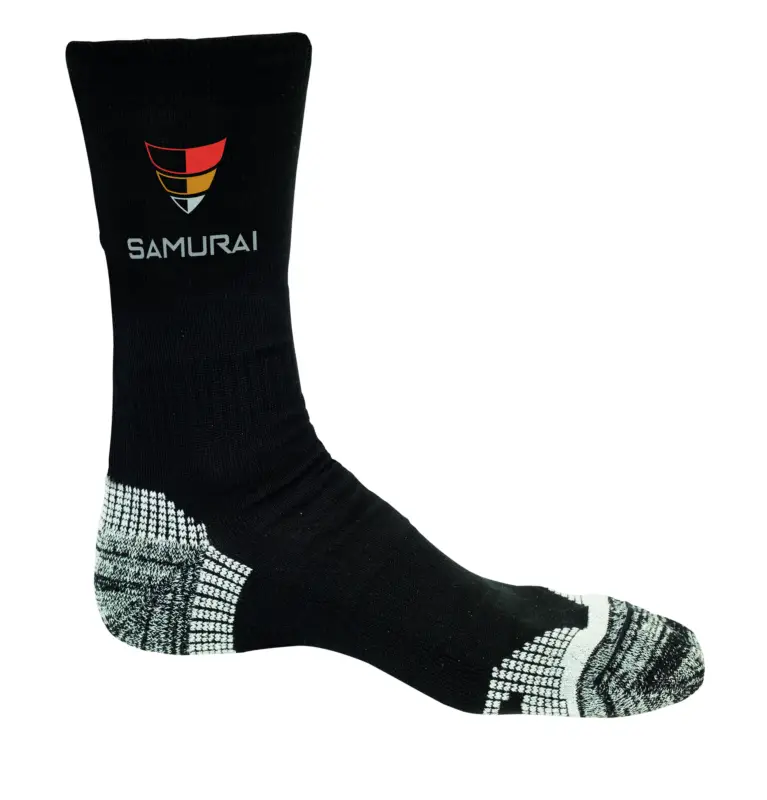 Mikado sok in vlamvertragende en antibacterieel materiaal. De hiel en het voorste deel zijn vervaardigd in flex line materiaal met “massage reliëf”, en voorzien van een extra sponsmateriaal. Met markering links (L) en rechts (R) op de sokken. Samenstelling: 35% wol, 35% viscose, 18% polyamide, 11% cordura, 1% elastaan.