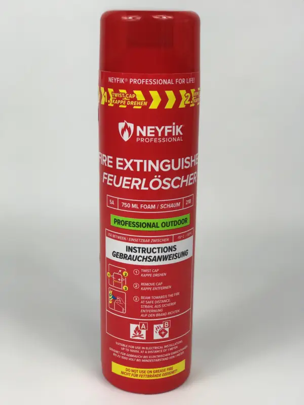 Professionele Outdoor Neyfik spray brandblusser klasse 5A/21B. Zeer compacte en doeltreffende blusser geschikt voor brandende vloeistoffen en vaste stoffen. De spray wordt geleverd met voertuighouder. Elke spray blusser bevat ook een controle schema die, indien gewenst, gebruikt kan worden om periodieke controles uit te voeren. De spray blusser is volledig onderhoudsvrij en heeft een levensduur van 5 jaar. De spray wordt geleverd met voertuighouder. Dit model bevat Engelstalige en Duitstalige tekst exclusief controleschema. Dit model is ook beschikbaar met Nederlandse tekst inclu sief controleschema (art. 1044623).