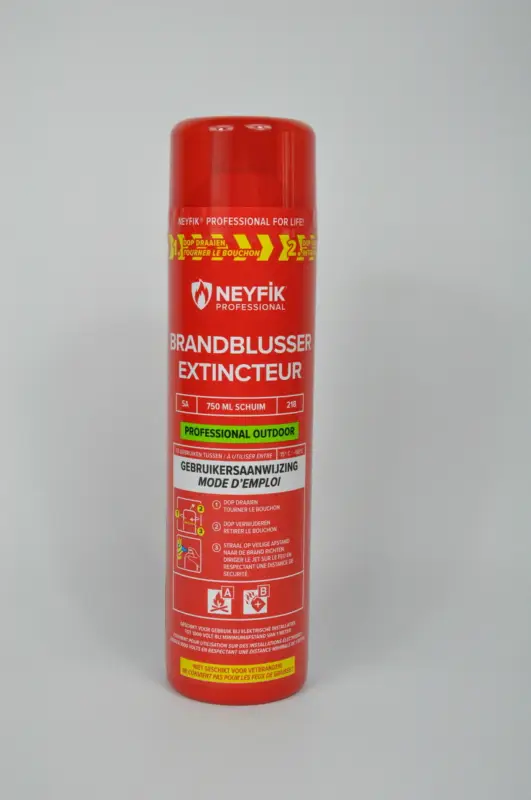 Professionele Outdoor Neyfik spray brandblusser klasse 5A/21B. Zeer compacte en doeltreffende blusser geschikt voor brandende vloeistoffen en vaste stoffen. De spray wordt geleverd met voertuighouder. Elke spray blusser bevat ook een controle schema die, indien gewenst, gebruikt kan worden om periodieke controles uit te voeren. De spray blusser is volledig onderhoudsvrij en heeft een levensduur van 5 jaar. De spray wordt geleverd met voertuighouder. Dit model bevat Franstalige tekst exclusief controleschema. Dit model is ook beschikbaar met Nederlandse tekst inclusief controleschema (art. 1044623).