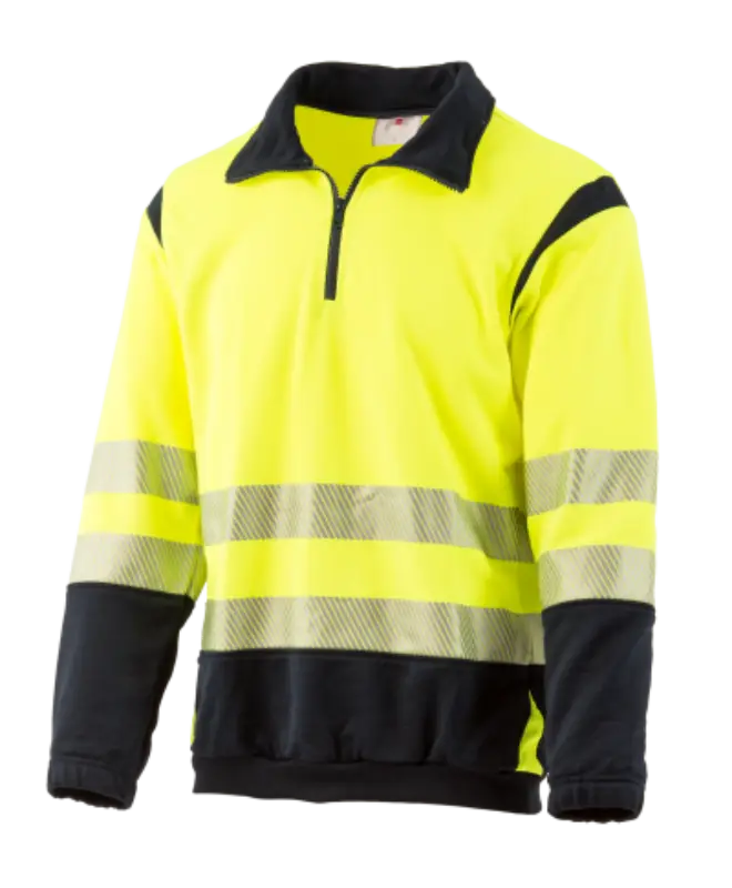 Sweater met opstaande kraag en rits: Middenvoor sluitend dmv korte rits; Coderingslap; volledige mouwzoom met elastiek; tricotboord zoom; 2 horizontale reflexiebanden op voor- ,rugpand en mouwen. Beschikbare kleuren: fluo geel/marine en fluo oranje/marine. Beschikbare maten: XS-4XL.