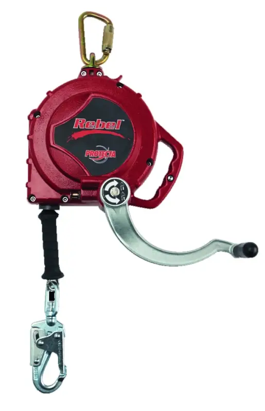 Valstopapparaat Rebel 15 meter gegalvaniseerde staalkabel met geïntegreerde schokdemper. Behuizing uit kunststof. Stopt vrijwel onmi ddellijk elke verticale valbeweging. Dient als verbinding tussen ankerpunt en harnas. Voorzien van ergonomische kabelhendel en musketonhaak met valindicator die toelaat te weten wanneer er zich een val heeft voorgedaan. De geïntegreerde reddingslier kan een persoon na een val optrekken of laten zakken. Met een simpele beweging kan dit blok van de valbeschermings- naar de reddingsmodus worden omgeschakeld. Kan aan ankeroog van driepikkel worden bevestigd of gemonteerd worden op poot van driepoot AM100 m.b.v. adapter.