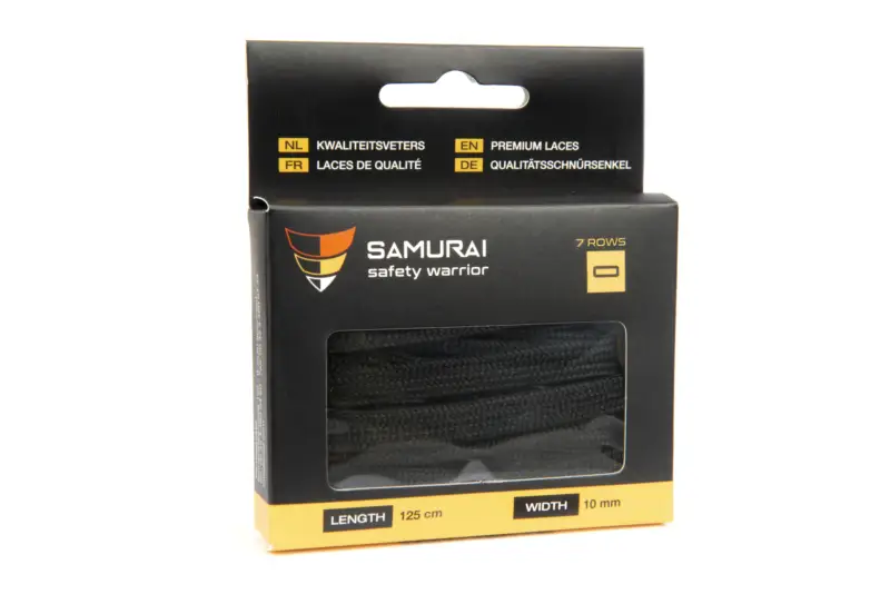 Zwarte platte veter in polyester. Lengte: 125cm. Geen PBM.